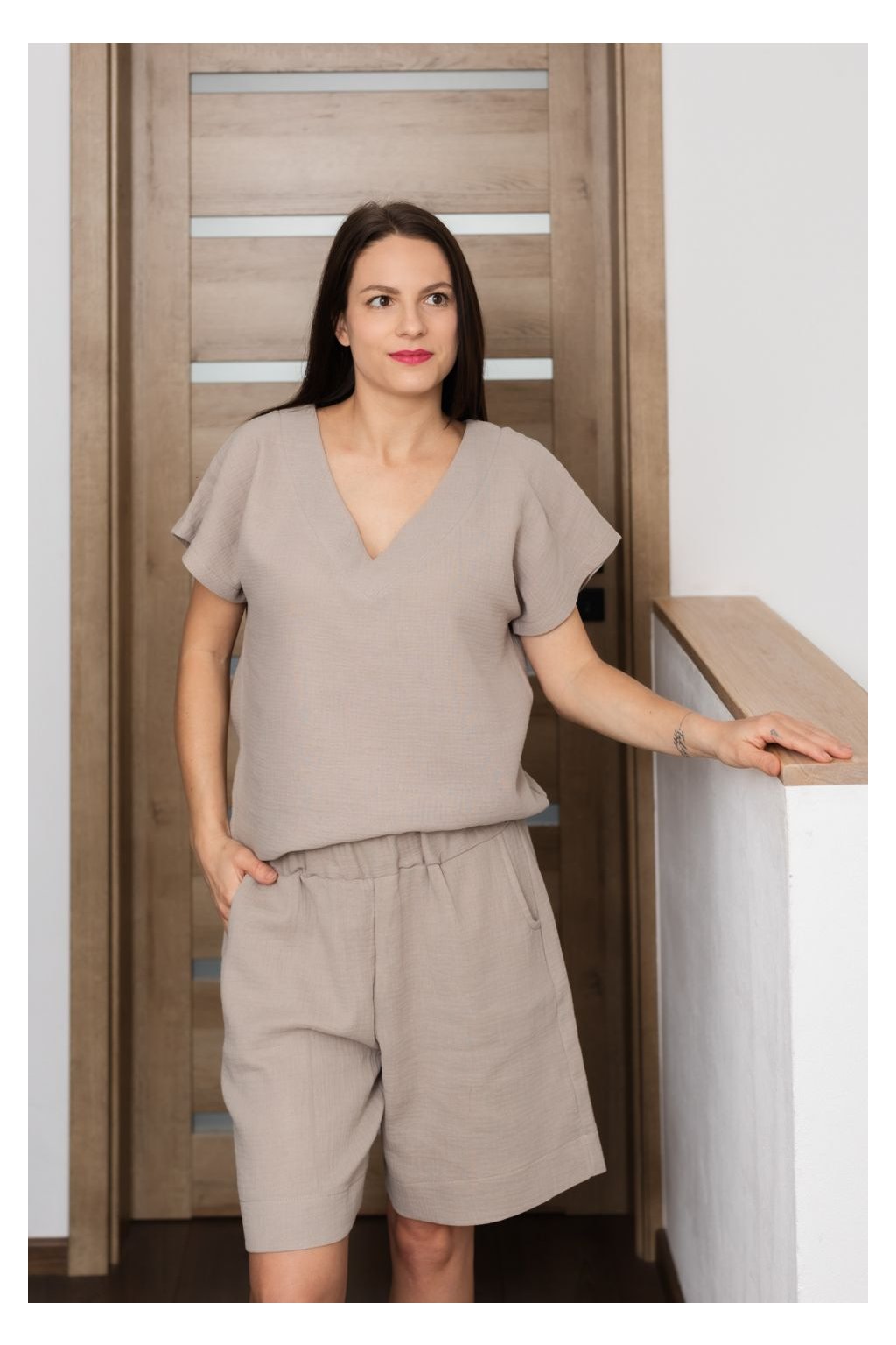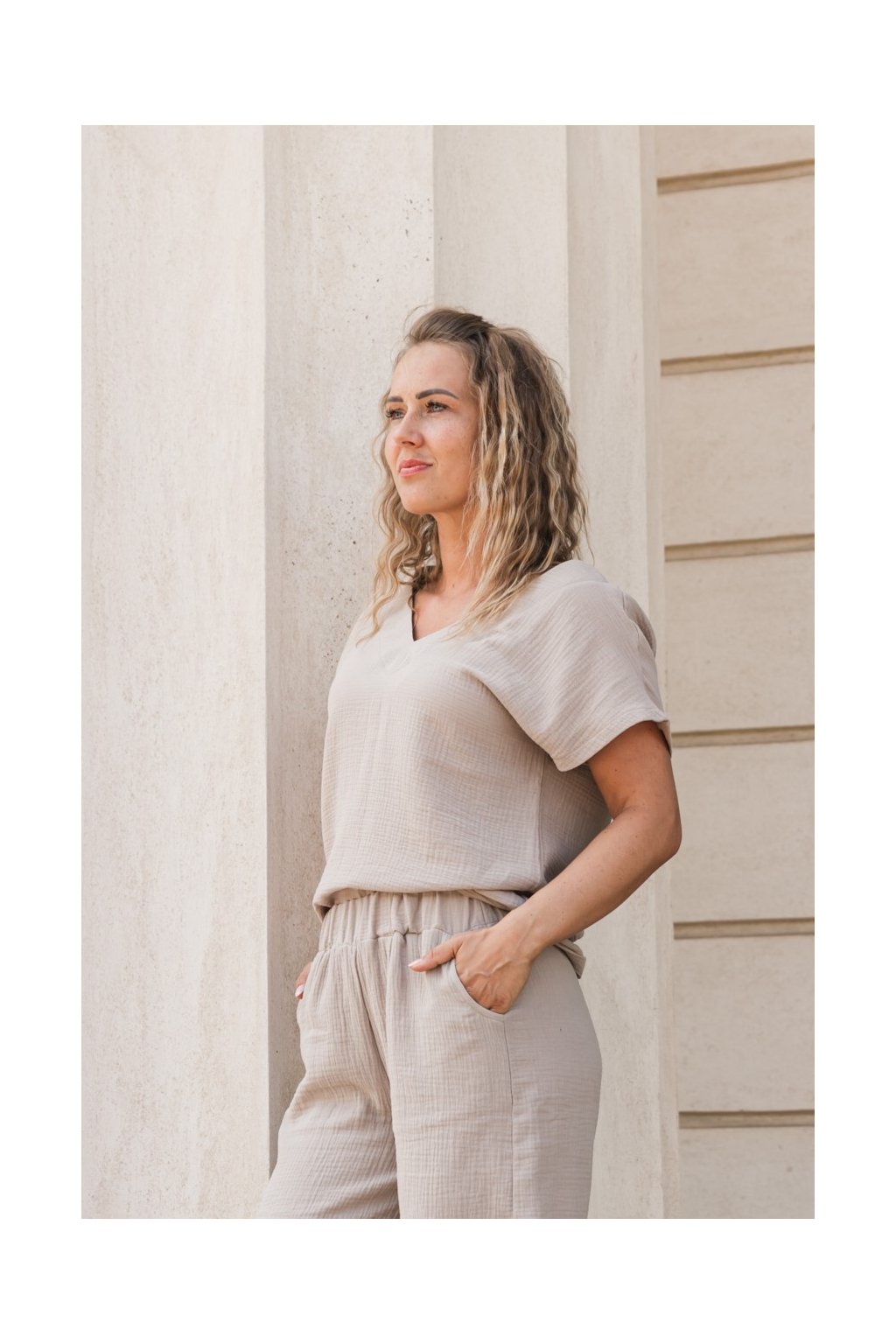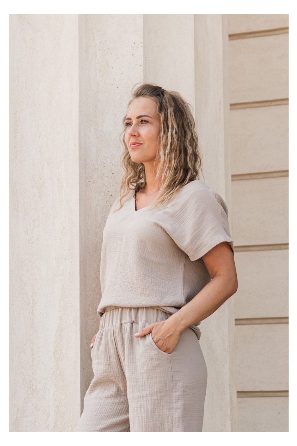 Lehké mušelínové triko s výstřihem z příjemného, prodyšného materiálu, který je jemný k pokožce a ideální pro každodenní nošení. Díky volnějšímu střihu poskytuje maximální pohodlí a přirozenou eleganci.