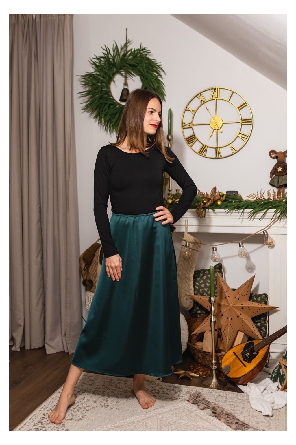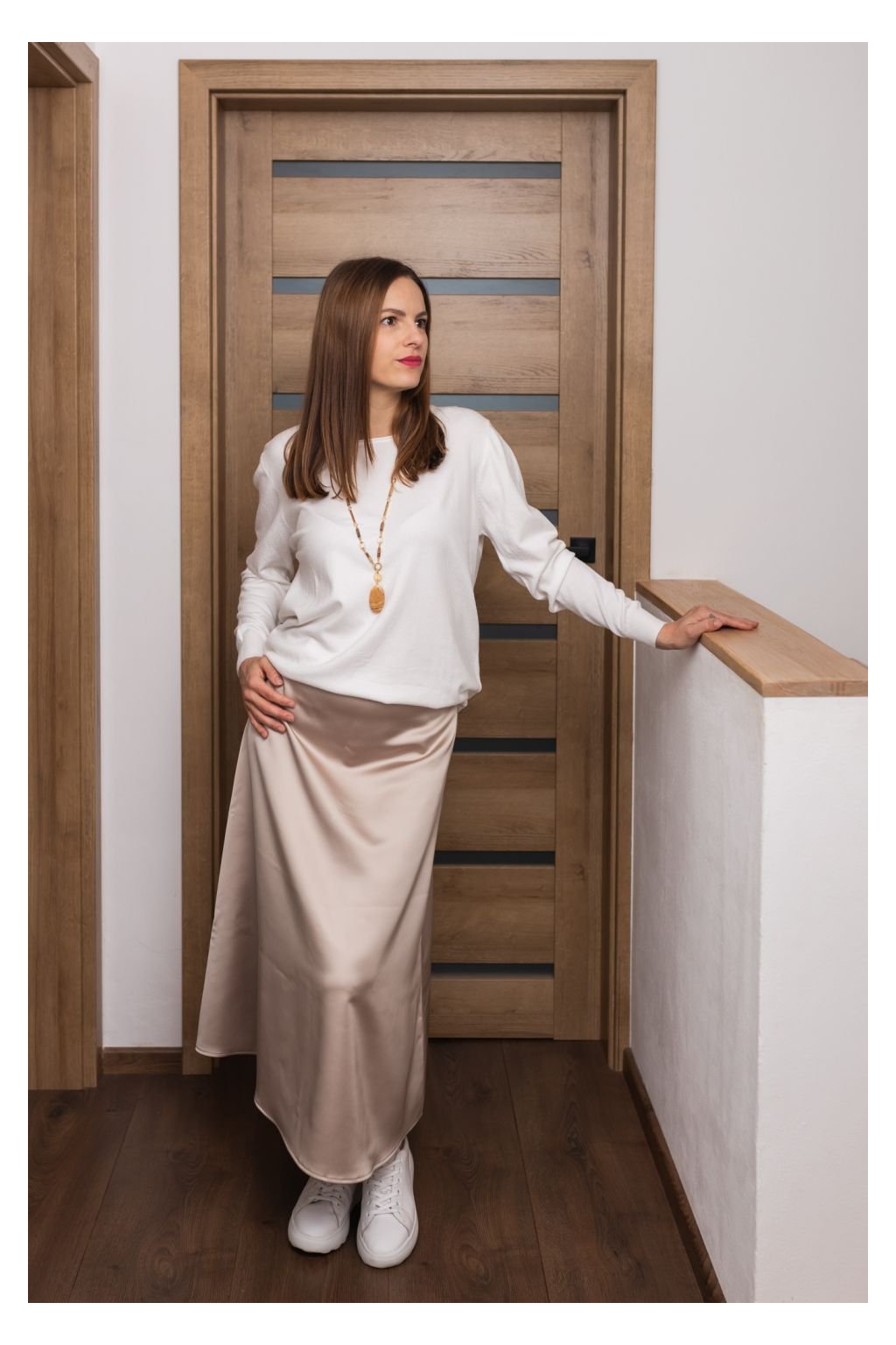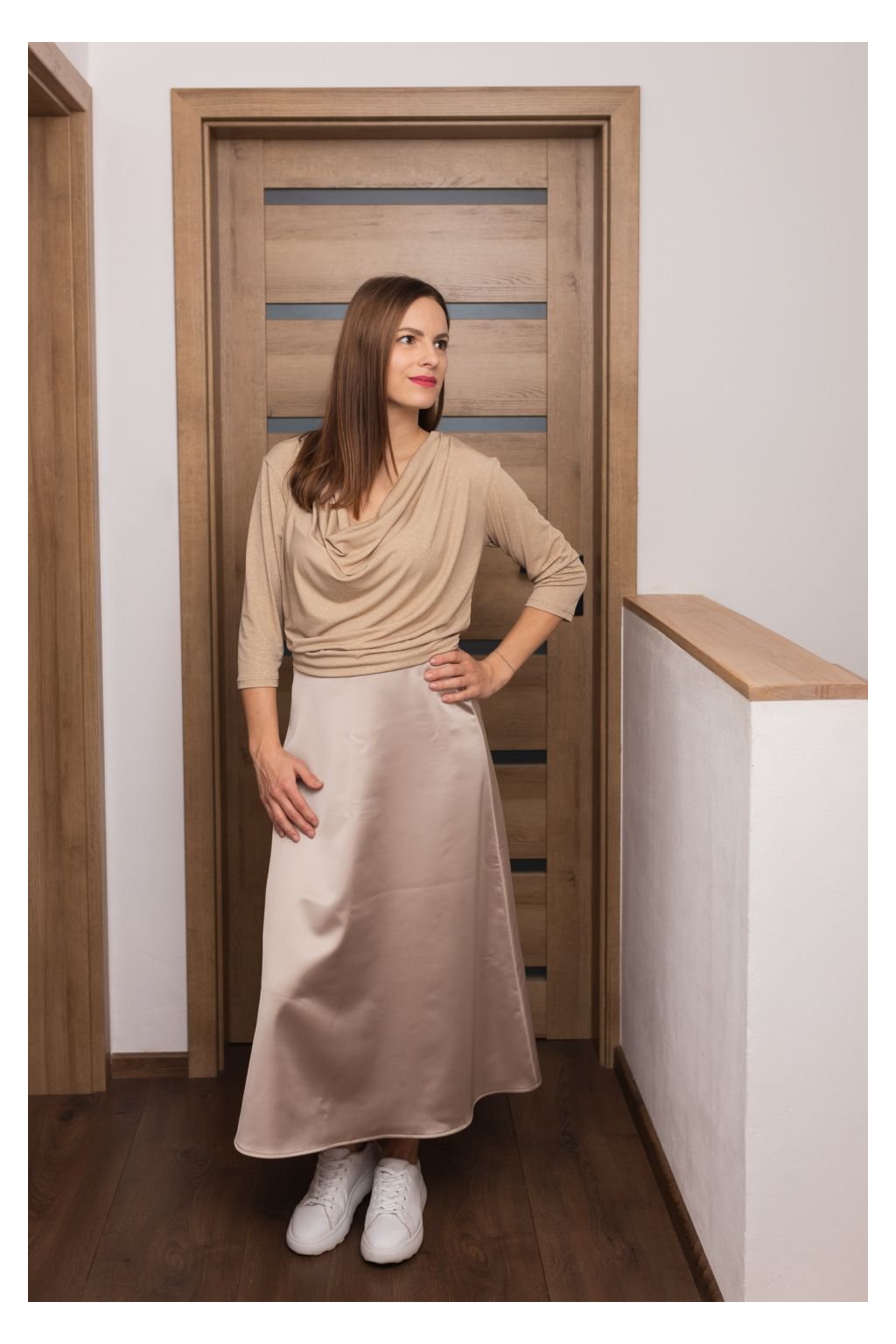 Saténová sukně je v pase na gumu.