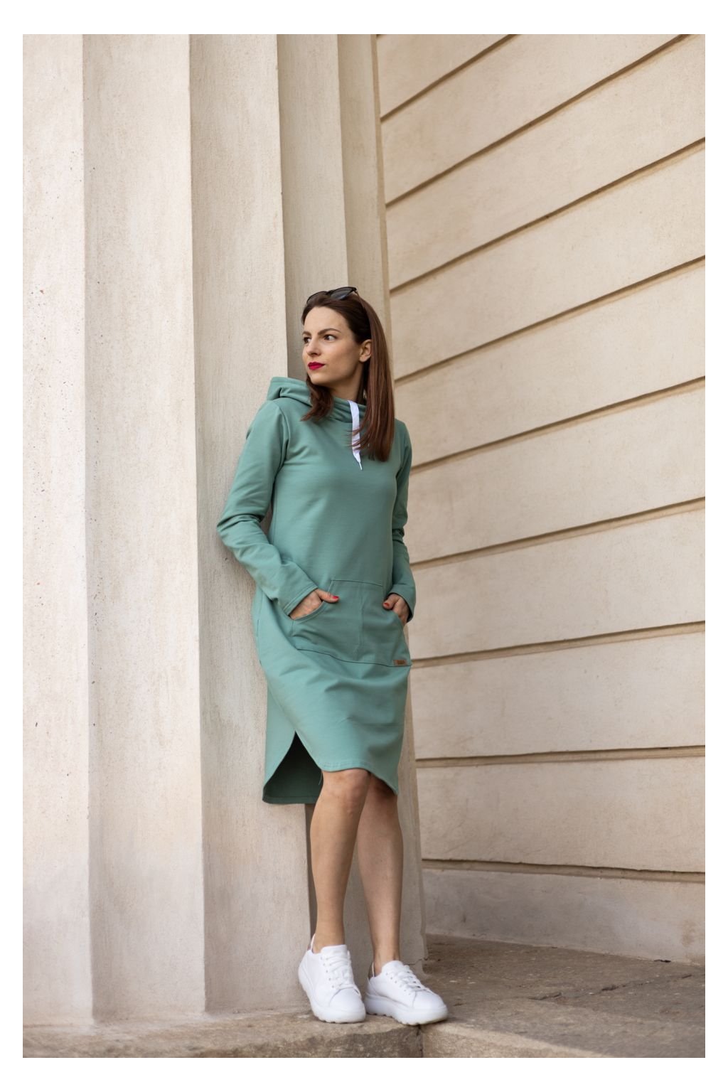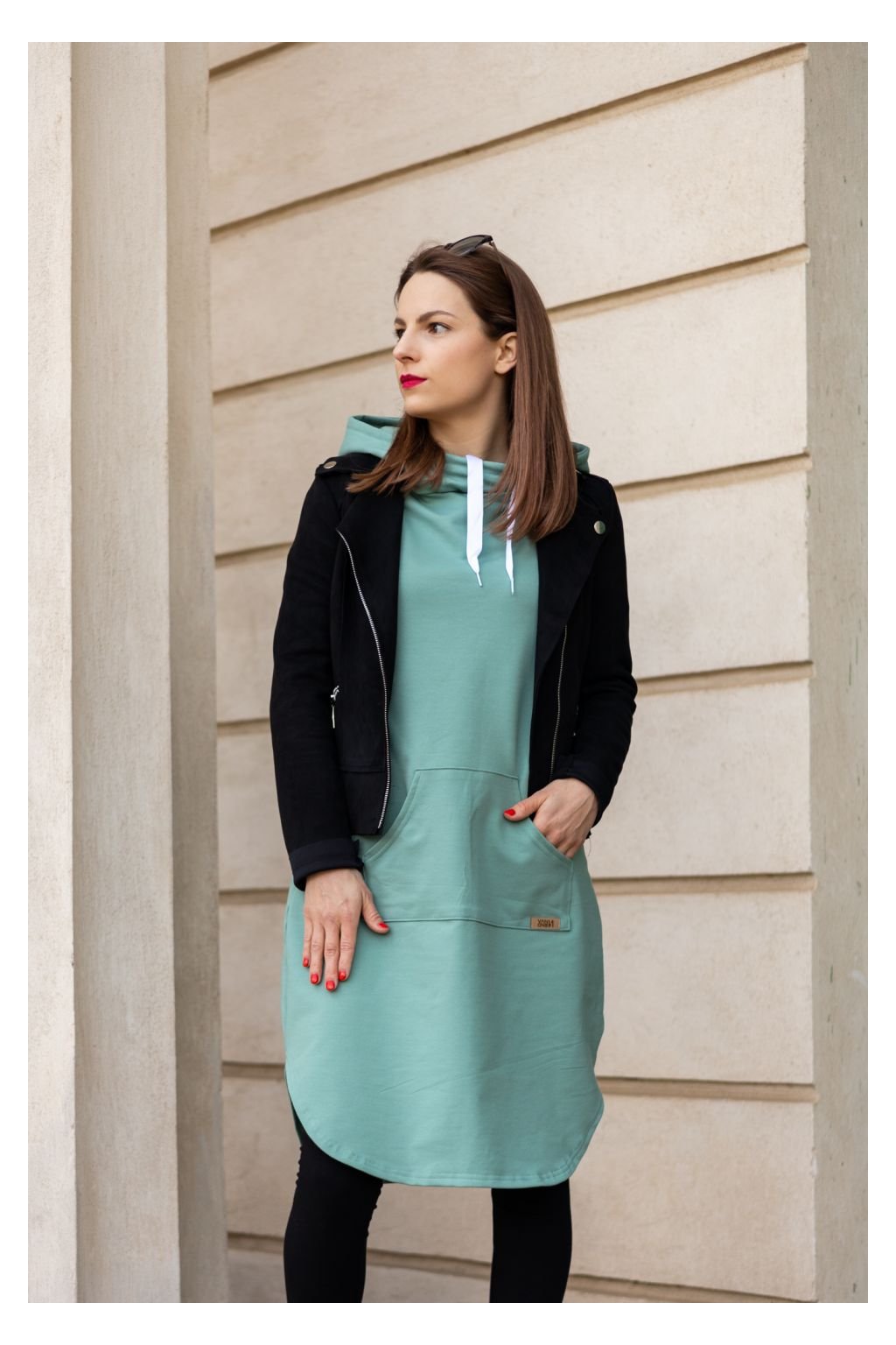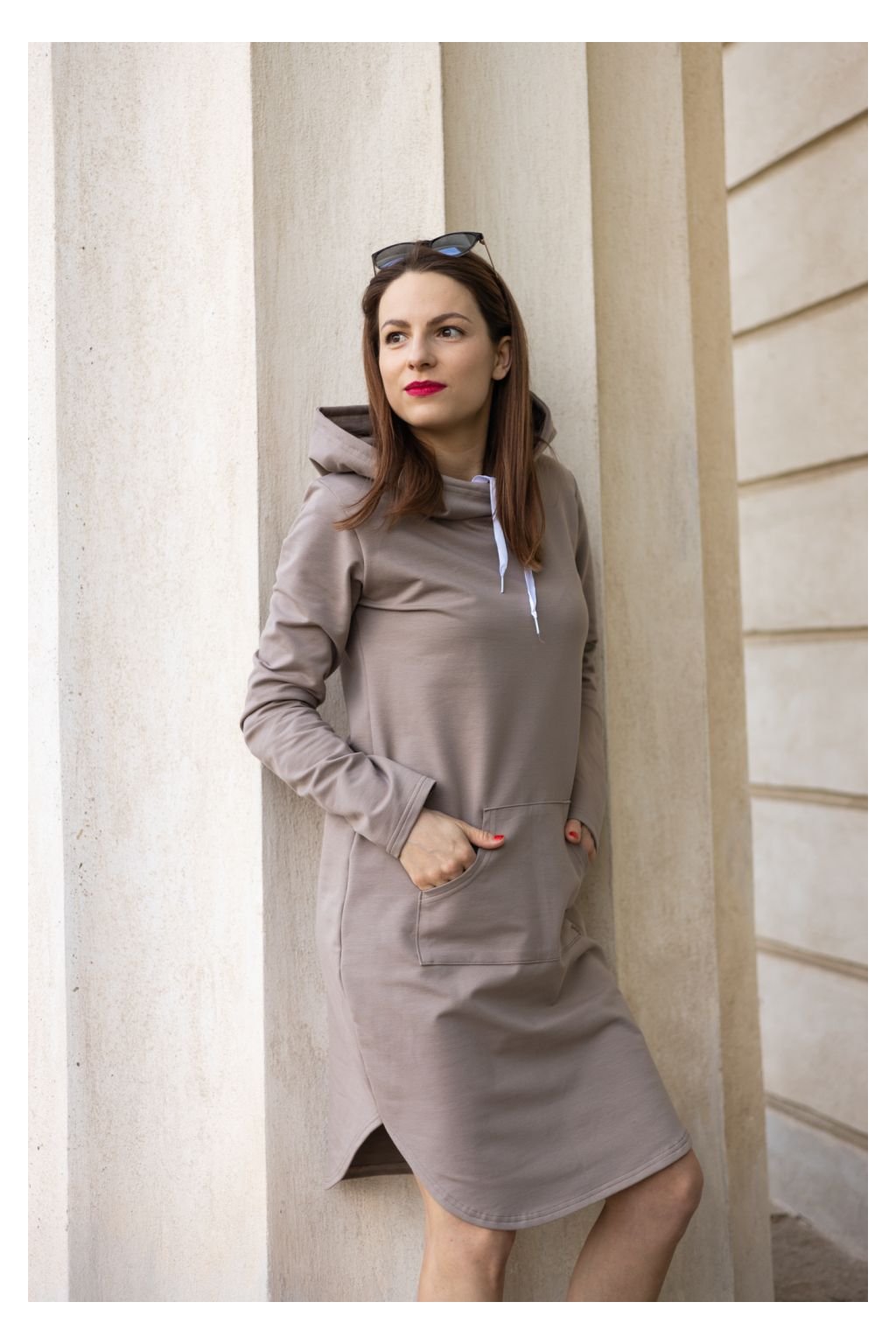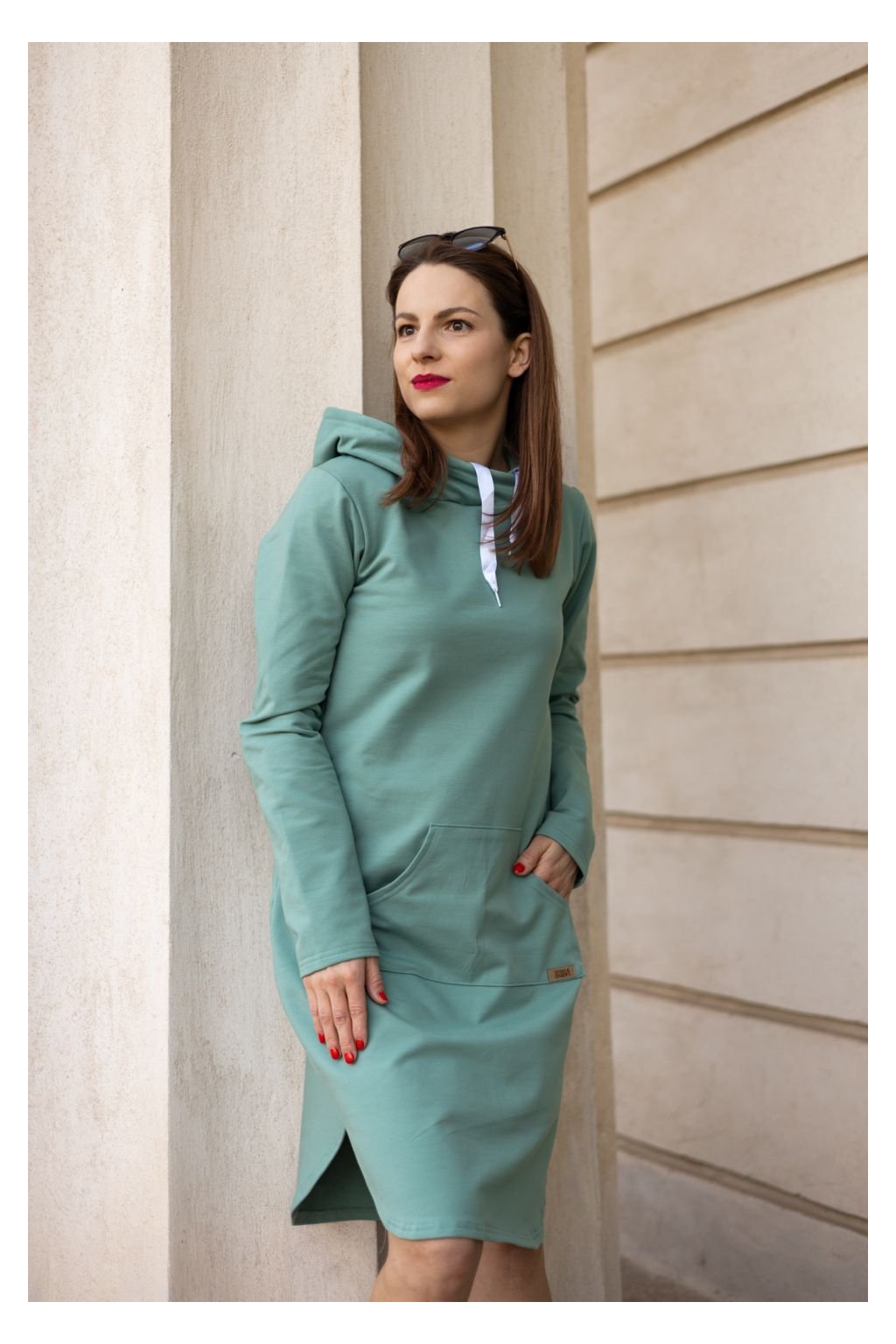 Šaty jsou ušity z velmi pěkné teplákoviny s pevnější vlastností. Jsou ušity s rozparkem do kulata, klokaní kapsou a kapucou, která je ozdobena stuhovými tkaničkami.
