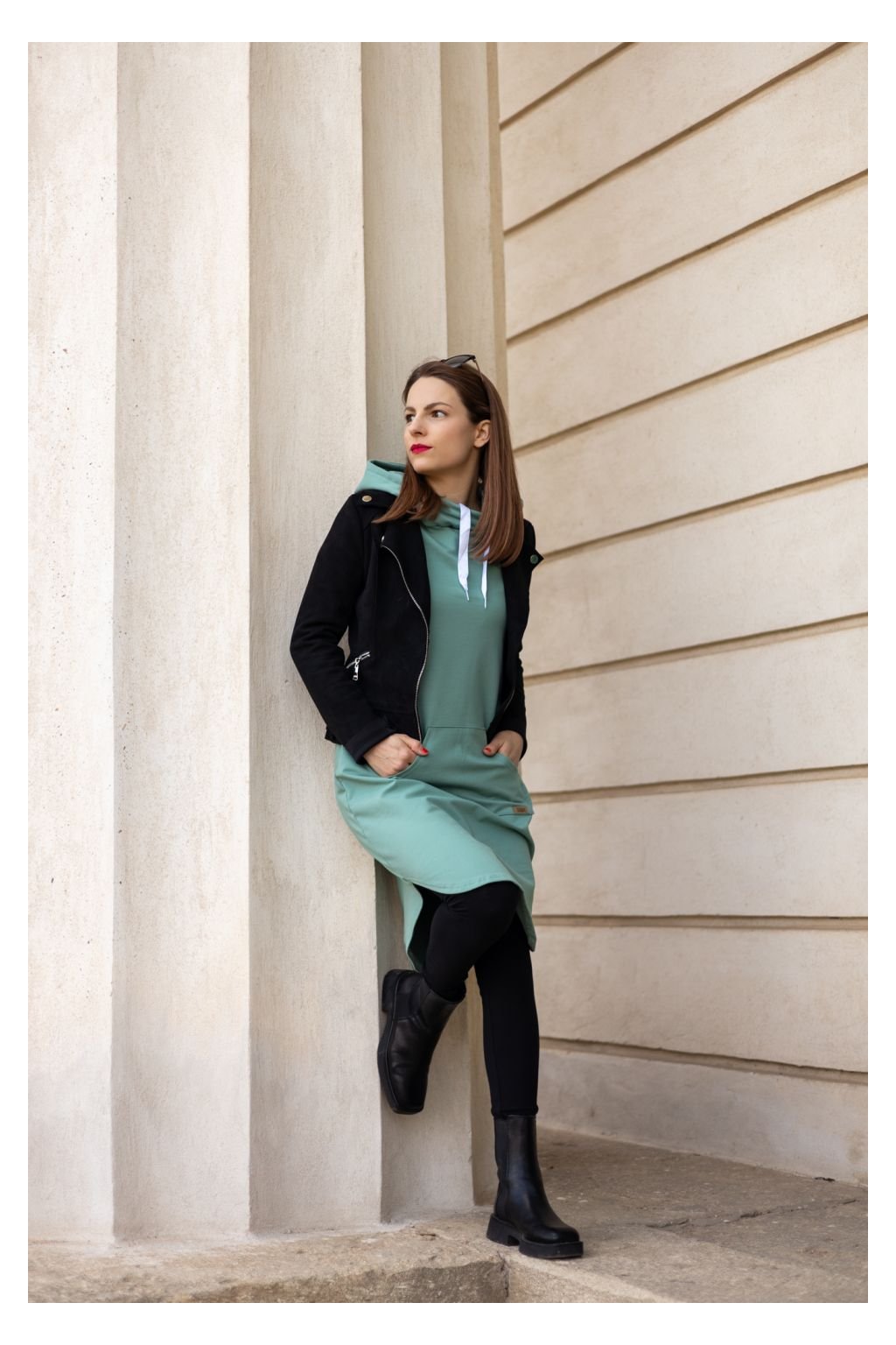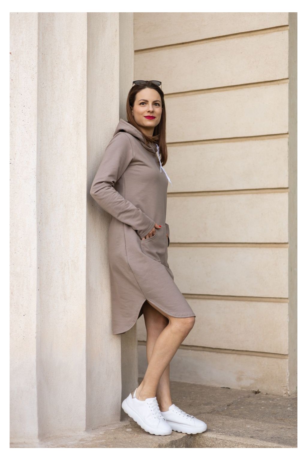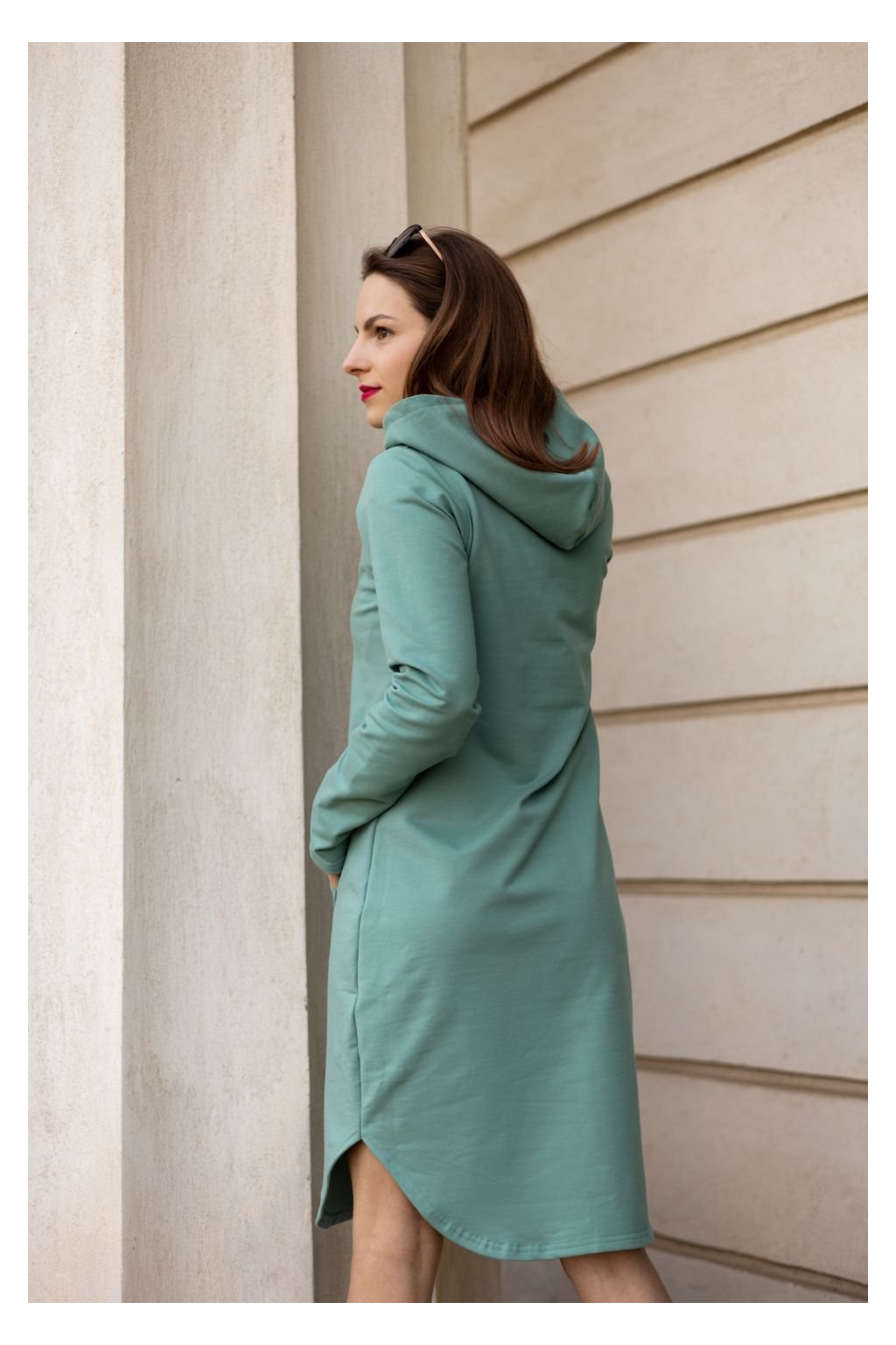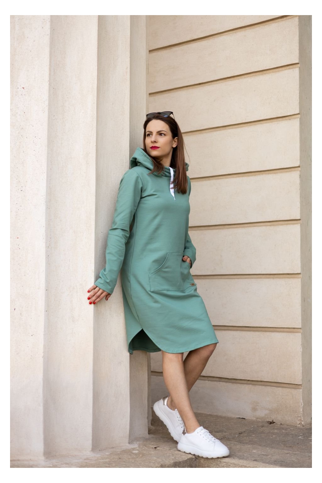 Šaty jsou ušity z velmi pěkné teplákoviny s pevnější vlastností. Jsou ušity s rozparkem do kulata, klokaní kapsou a kapucou, která je ozdobena stuhovými tkaničkami.